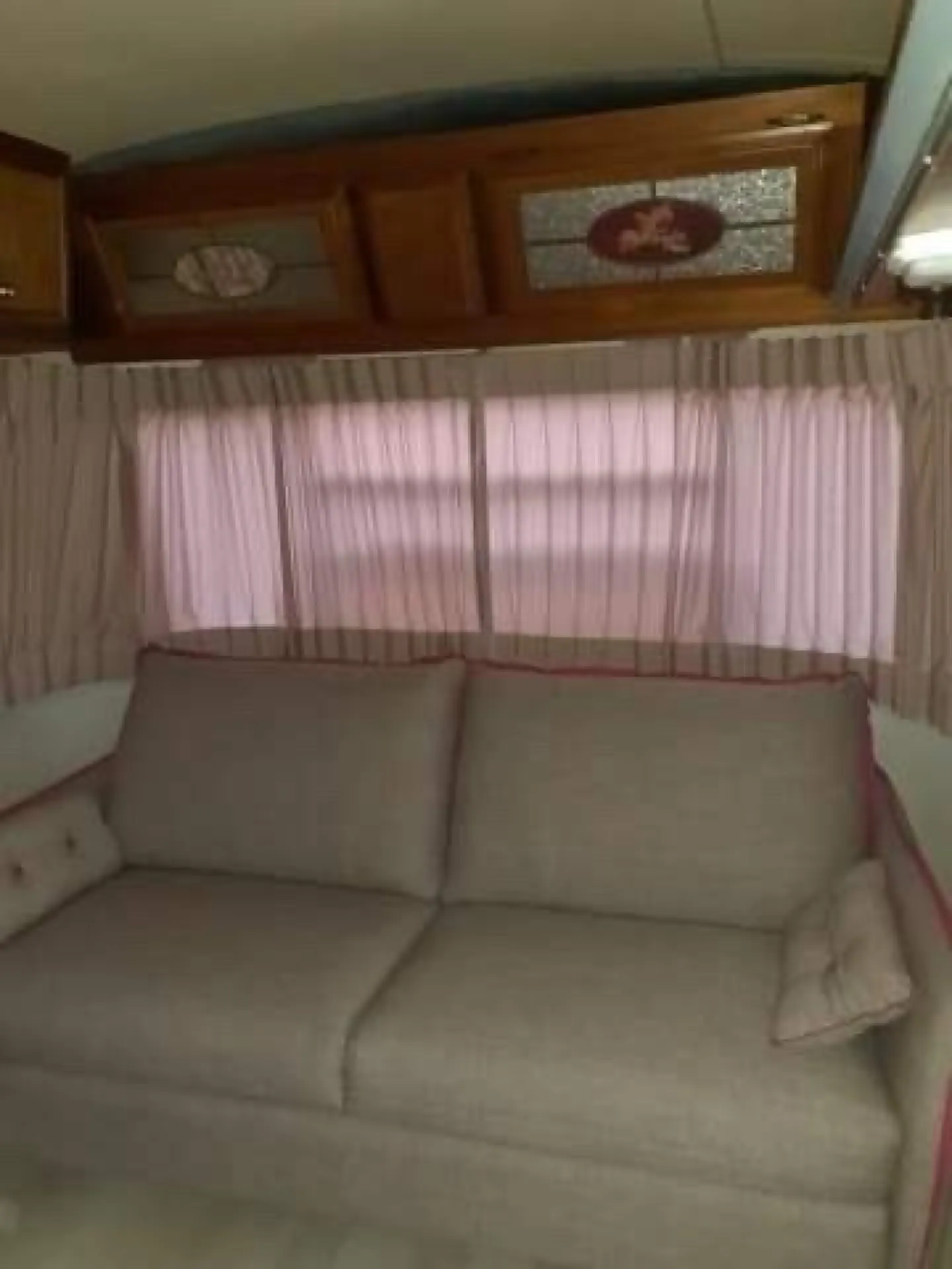 Les clients sont venus à l'atelier avec leurs rideaux pour leur caravane en voulant les moderniser. Nous leur avons proposé un tissu frais, clair pour éclaircir l'environnement et pour s'adapter à leur canapé. Nous avons choisi un tissu rose pâle, occultant, facile d'entretien et anti-UV. Pour les mêmes clients nous avons aussi réalisé des stores rouleau, ils protègent contre la chaleur et l’éblouissement. Nous sommes restés sur une couleur gris clair pour garder cette ambiance épurée.