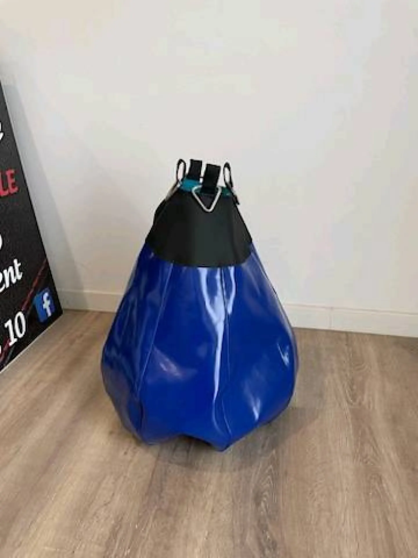 C’est un sac sphero-conique en toile de bâche avec renfort en cuir. Les dimensions, plans ont été fournis par la société. C'est avec cela que nous avons réalisé ce nouveau sac de choc.