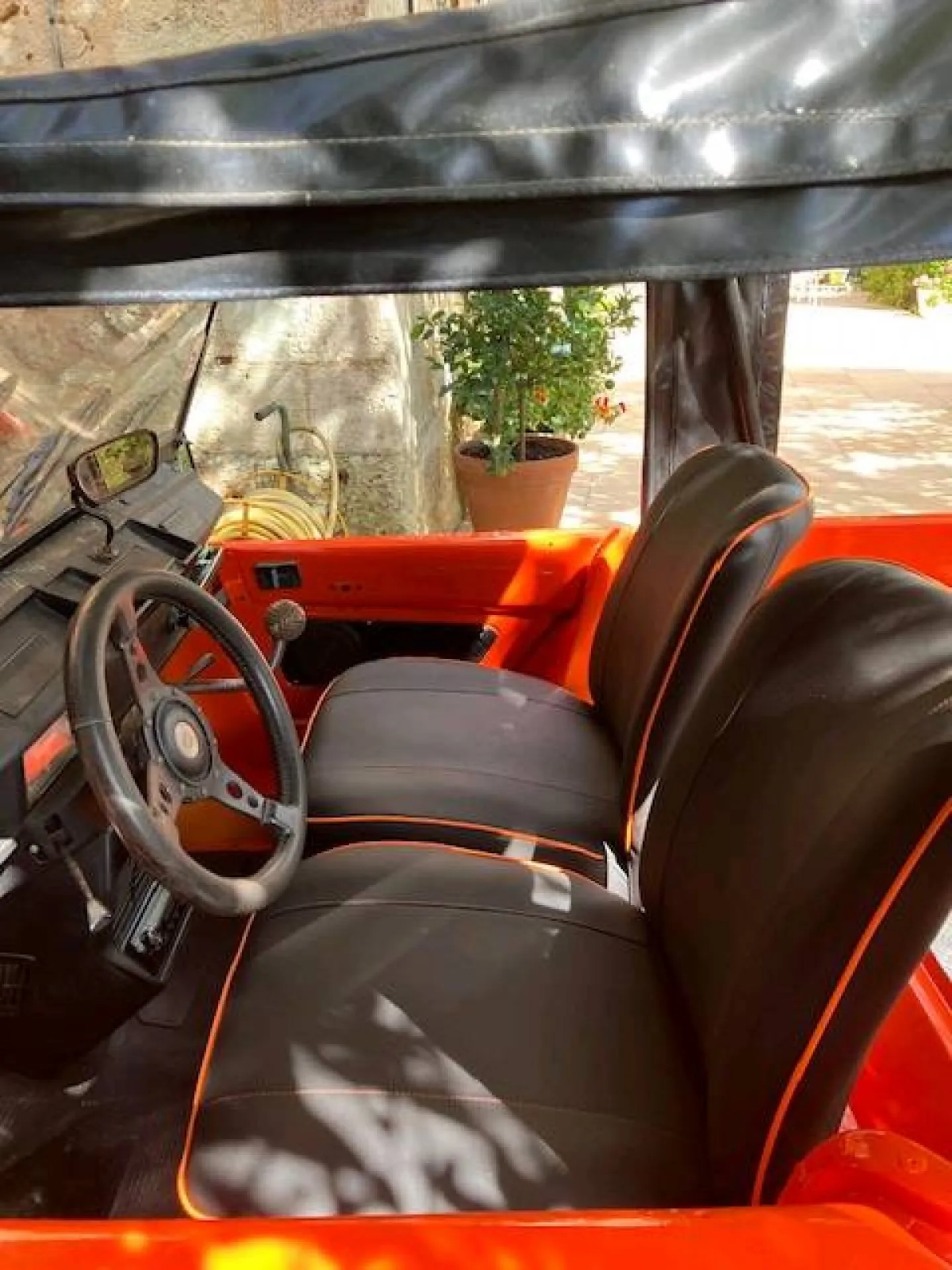 Le client a souhaité avoir des sièges esthétiques mais discrets. Il nous a indiqué son budget à ne pas dépasser. Nous lui avons proposé un Skaï mat noir et pour donner une touche de pep's un passepoil orange qui rappelle la carrosserie de sa Renault Rodéo. Les découpes ont été conservées, une mousse de 1cm à été rajoutée pour redonner du volume.
