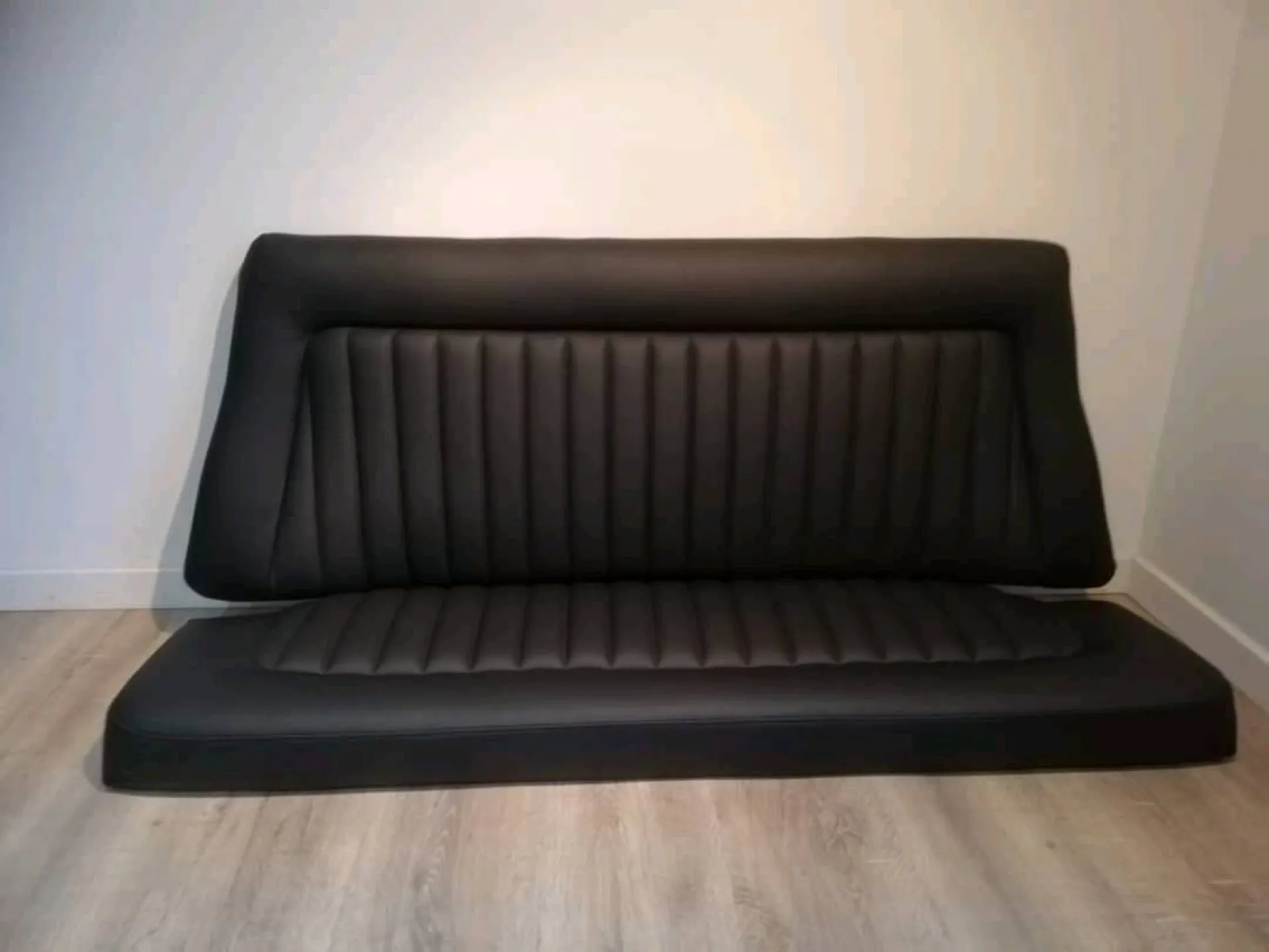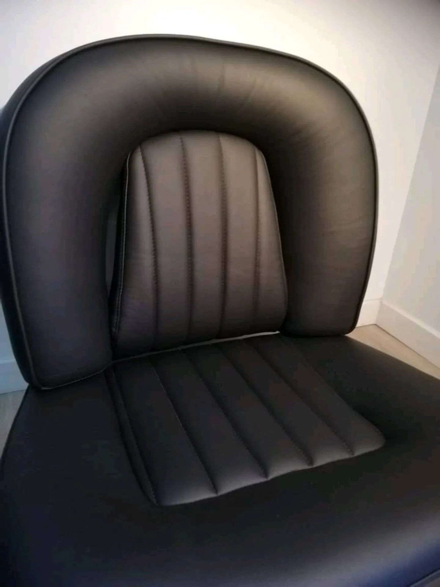 Les mousses ont été rénovées pour plus de confort et de maintien. Le client a choisi la richesse et la beauté du cuir noir mat. Nous avons restauré les sièges avants, la banquette arrière, les panneaux de portes et le tableau de bord à l'identique.